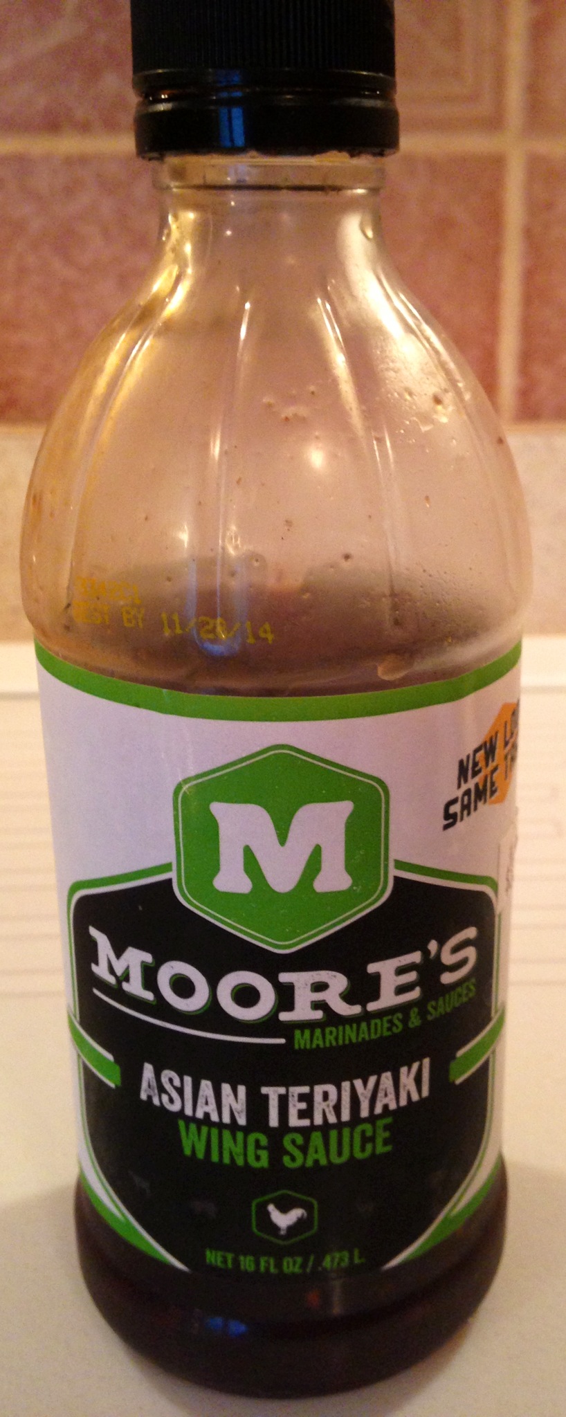 one inch chunks. I heated my skillet on medium high, and added the boneless skinless chicken. I then added the pepper and onions to the mix. I finally added about 4 oz. of Moore’s Asian Teriyaki Sauce to the skillet. This is a fantastic sauce. It is sweet with just enough of a kick to make it interesting. The Butcher does not like hot; however, he loves this sauce. I cooked, stirring frequently for approximately 18 minutes until the