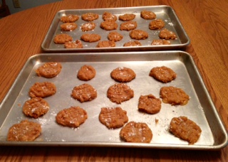 night. I was captivated by a recipe for Flourless Peanut Butter Cookies. It caught my attention because I know so many people who have Gluten free diets. When I looked at the recipe and saw that there were only 4 ingredients I was hooked. I had to make the recipe. The Butcher was asleep on the couch when I started assembling the cookies. I made a double batch. Finally about 11:30 p.m. I woke the Butcher up and we went up to bed. He was a little cranky. He doesn’t like to fall asleep on the couch. He didn’t understand why I had to stay up so late making cookies. I took the cookies in to the store the next day. The Butcher tried one. He gave it the thumbs up. He even forgave me for staying up late to bake them. He said he is not really a “cookie” kind of guy but he would take these anytime.