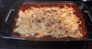 Place the zucchini in a 9 X 13 inch glass dish. Pour 2 Tablespoons of Extra Virgin Olive Oil over the zucchini and mix it together with your hands. Place the Bolognese sauce over the zucchini noodles. Place the grated cheese on top of the sauce. Put the dish in the oven and bake for 15 to 20 minutes.